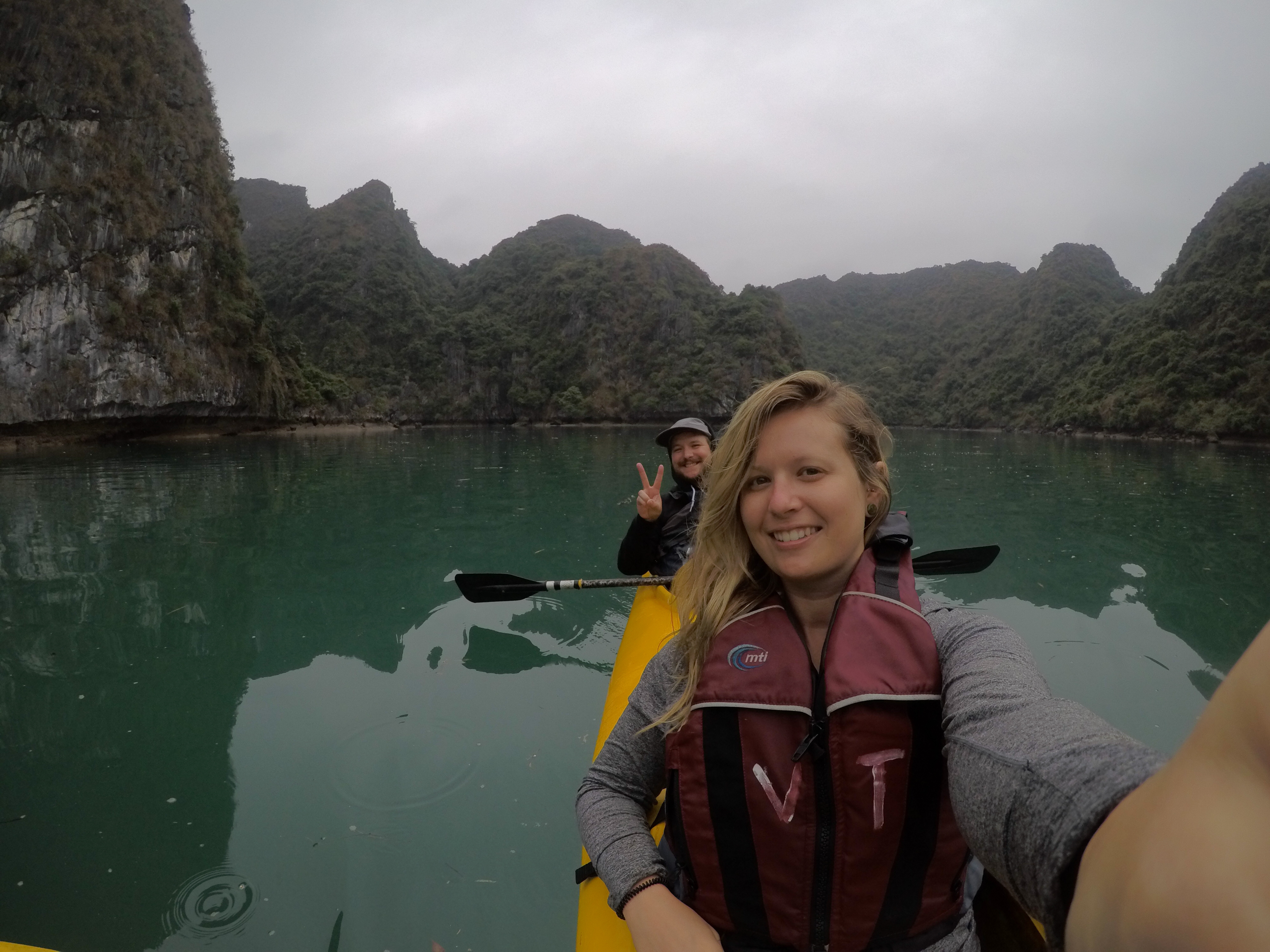 We spent two nights in Cat Ba, but our best day there was doing a boat trip through Ha Long Bay. Our gracious host at the Coffee Scent Hostel facilitated a relatively cheap excursion ($17 per person) and we didn’t regret it. The limestone islands vary in size as the shoot up out of the ocean, but there are some 1,600 islands that create a unique landscape. As we cruised between the limestone behemoths, we were taken out to a small kayaking adventure which was a blast. Mandy and I able to kayak through several natural caves, and again made our mission to pick up as much trash as we could that was floating in the water. A couple of French gals were doing the same. The sad truth is in SE Asia, for every one of us, there is 100 others who throw their trash everywhere with no regard. Still, it was refreshing to not be the only ones who gave a damn!