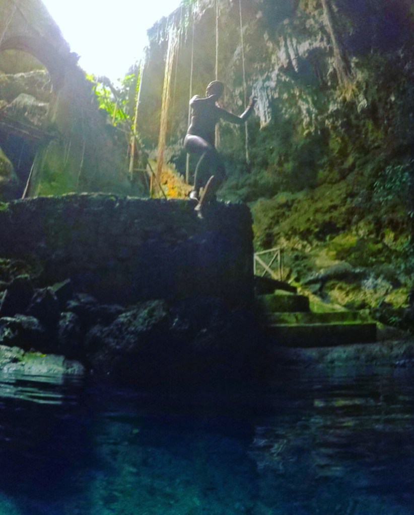 Walking down the concrete stairs there is a ledge with roughly a 10 foot drop that you can dive off of. The pool itself significantly larger than the first two cenotes and allowed you to swim as far back as you wanted considering the swarms of bats and birds who called this cenote home.
