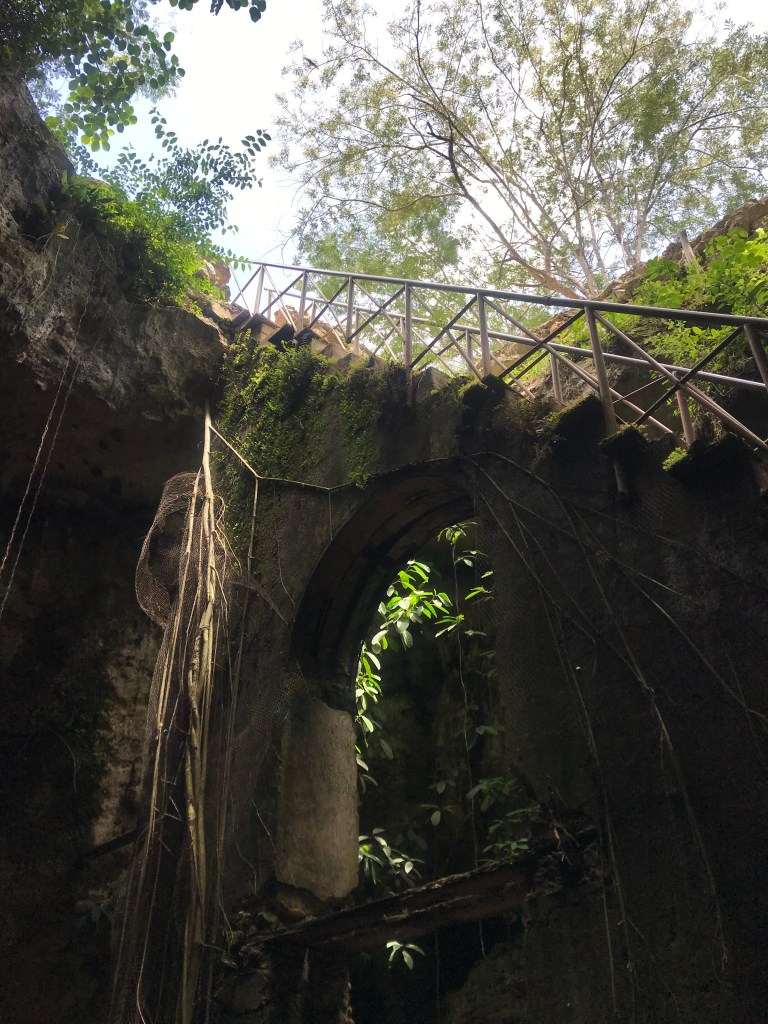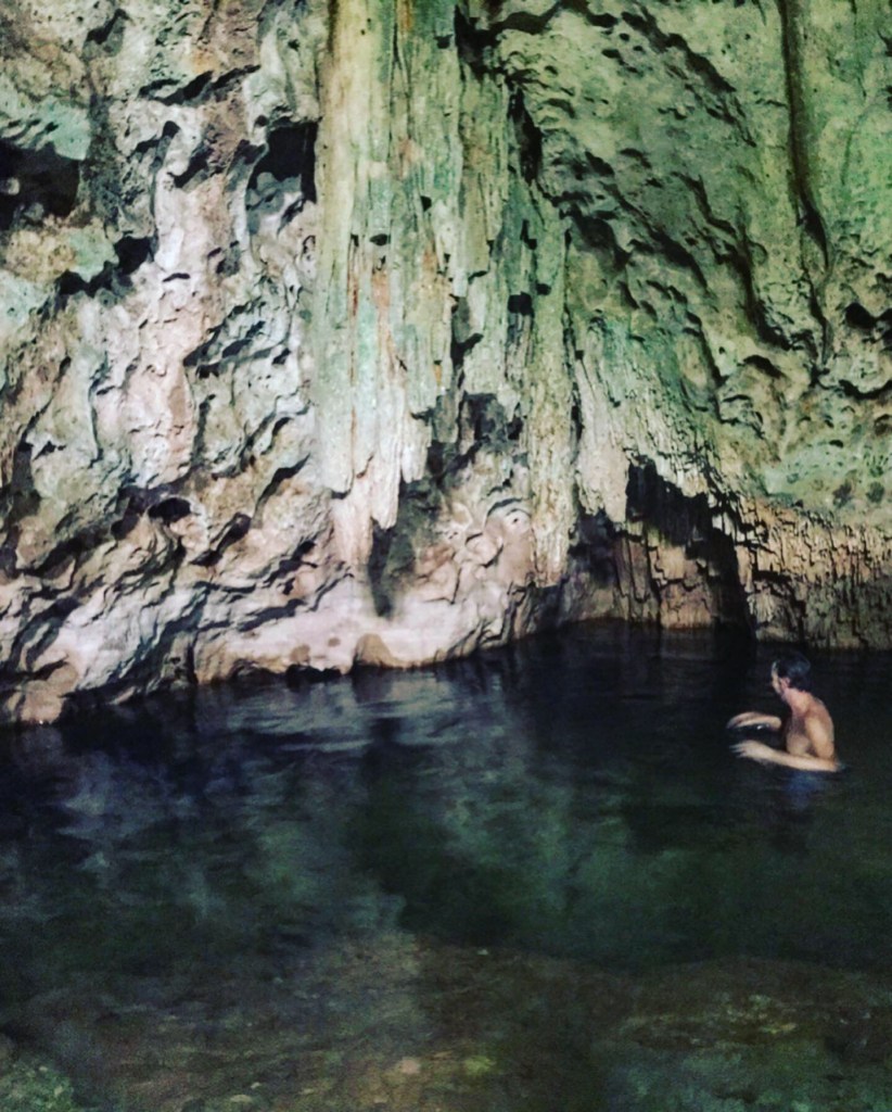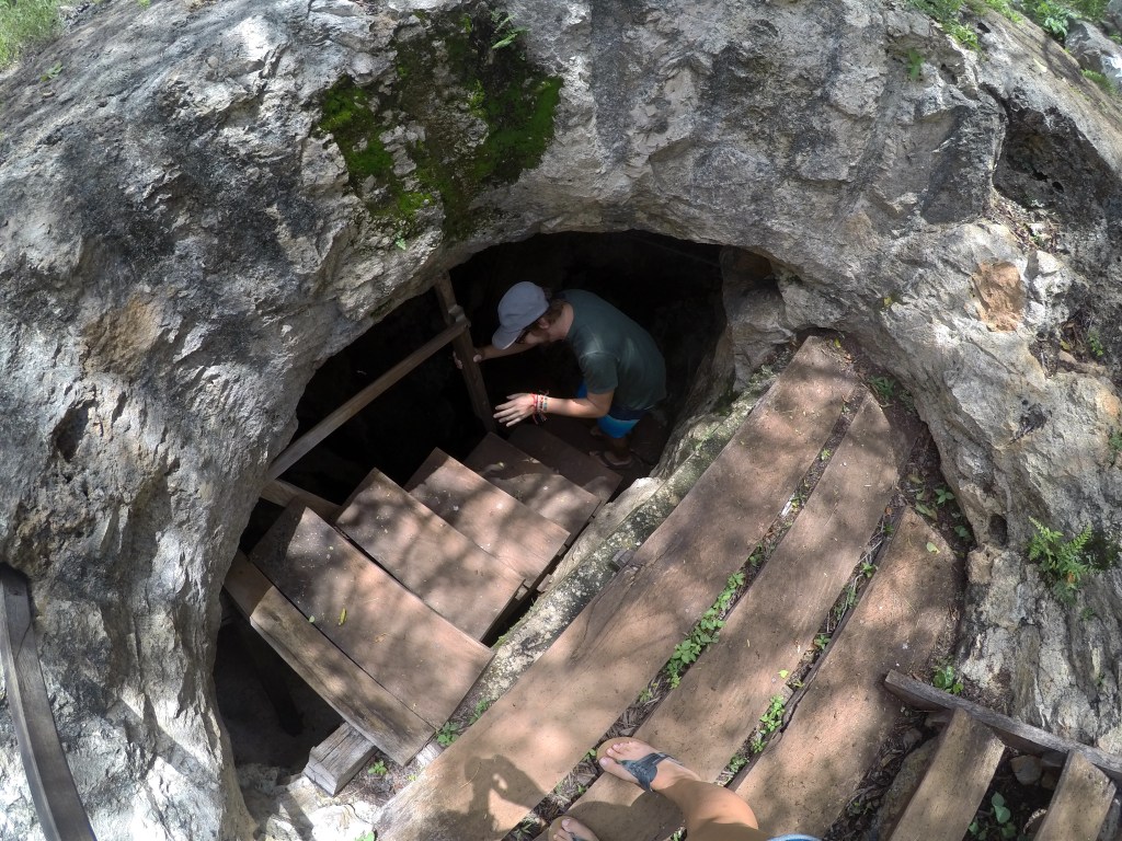 The second cenote, Santa Cruz, had more inhabitants sharing our space from bats to black catfish looking fish in the pools. The bats produced a less than attractive smell from the guano and the fish were very curious about me in the water. Taking little nibbles of my feet and back, a service some paid for on the streets of Cambodia left me eager to get out of the water as soon as possible. The space was very cool and all to ourselves however, which added to the creepy factor when peering down through the clear water to the abyss